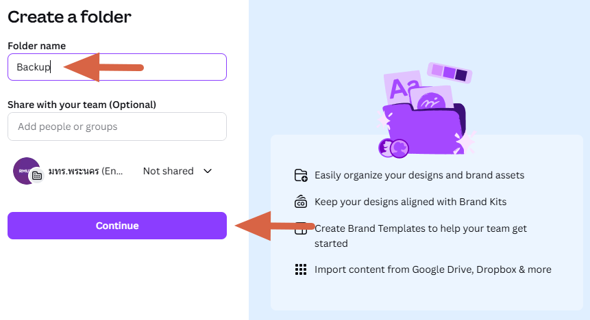 3.3 ตั้งชื่อโฟลเดอร์ ในตัวอย่างนี้ คือ Backup แล้วคลิก Continue จะได้โฟล์เดอร์ใหม่ Bacup ขึ้นมา