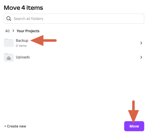 3.5 เลือกโพลเดอร์ที่เราสร้างไว้ ในตัวอย่างนี้คือ Backup แล้วคลิก Move