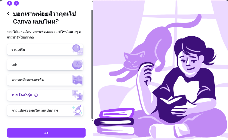 2.3  Canva จะมีคำถามสอบถามความสนใจผู้ใช้งานสั้น จากนั้นให้คลิก ส่ง