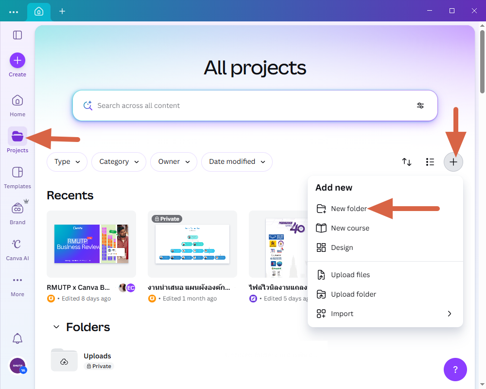 3.2 สร้างโฟล์เดอร์ เพื่อรวบงานที่ต้องการย้าย โดยคลิก Project > จากนั้น คลิกที่ + > แล้วคลิกที่ New Folder