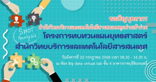 ขอเชิญบุคลากรสำนักวิทยบริการและเทคโนโลยีสารสนเทศทุกท่านเข้าร่วมโครงการทบทวนแผนยุทธสาสตร์สำนักวิทยบริการและเทคโนโลยีสารสนเทศ วันอังคารที่ 22 กรกฏาคม 2568 เวลา 8.30 – 16.30 น. ณ ห้อง Big data virtual lab ชั้น 4 อาคารราชบุรีดิเรกฤทธิ์