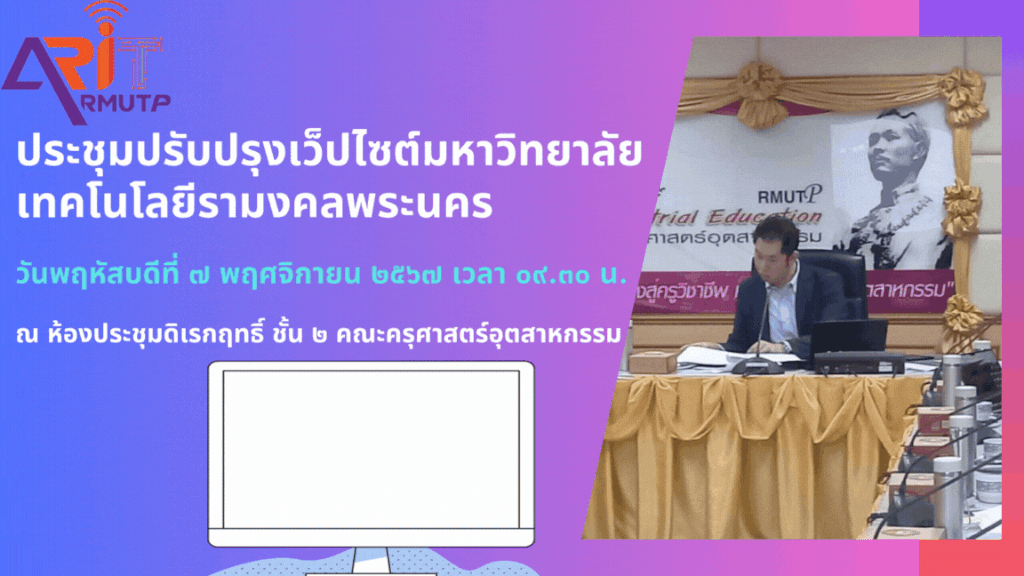 ประชุมปรับปรุงเว็ปไซต์มหาวิทยาลัยเทคโนโลยีรามงคลพระนคร วันพฤหัสบดีที่ ๗ พฤศจิกายน ๒๕๖๗ เวลา ๐๙.๓๐ น. ณ ห้องประชุมดิเรกฤทธิ์ ชั้น ๒ คณะครุศาสตร์อุตสาหกรรม