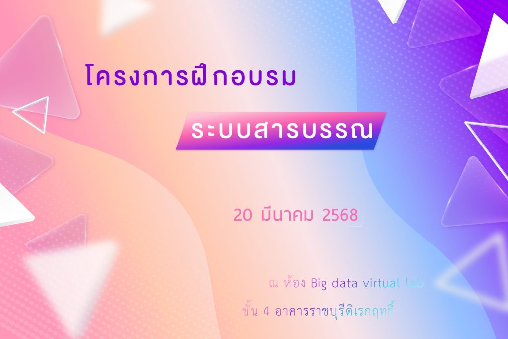 วันที่ 20 มี.ค. 2568  ณ ห้องฝึกอบรม Big Data Virtual Lab ชั้น 4 อาคารราชบุรีดิเรกฤทธิ์ ศูนยเทเวศร์ กรุงเทพฯ สวส. จัดโครงการฝึกอบรมระบบงานสารบรรณ สำหรับบุคลากรที่เกี่ยวข้องกับงานสารบรรณ เพื่อให้บุคลากรมีความรู้ความเข้าใจในระบบงานสารบรรณ ลดขั้นตอนการทำงาน
