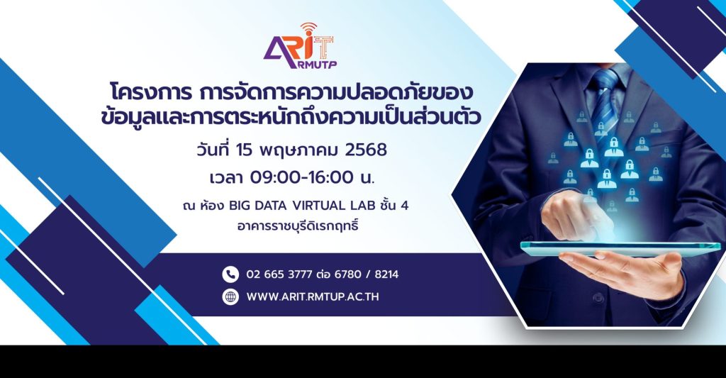 วันที่ 15 พฤษภาคม 2568 ณ ห้อง Big data virtual lab ชั้น 4 อาคารราชบุรีดิเรกฤทธิ์ สวส. จัดโครงการการจัดการความปลอดภัยของข้อมูลและการตระหนักถึงความเป็นส่วนตัว เพื่อให้ผู้เข้าร่วมอบรมมีความรู้และความเข้าใจ ในสาระสำคัญของพระราชบัญญัติคุ้มครองข้อมูลส่วนบุคคลพ.ศ. 2562 และเพื่อให้ผู้เข้าร่วมอบรมมีความรู้และความเข้าใจในมาตรการทั่วไป และมาตรการด้านความมั่นคงปลอดภัยสารสนเทศที่จำเป็นต้องนำมาใช้งานกับองค์กร