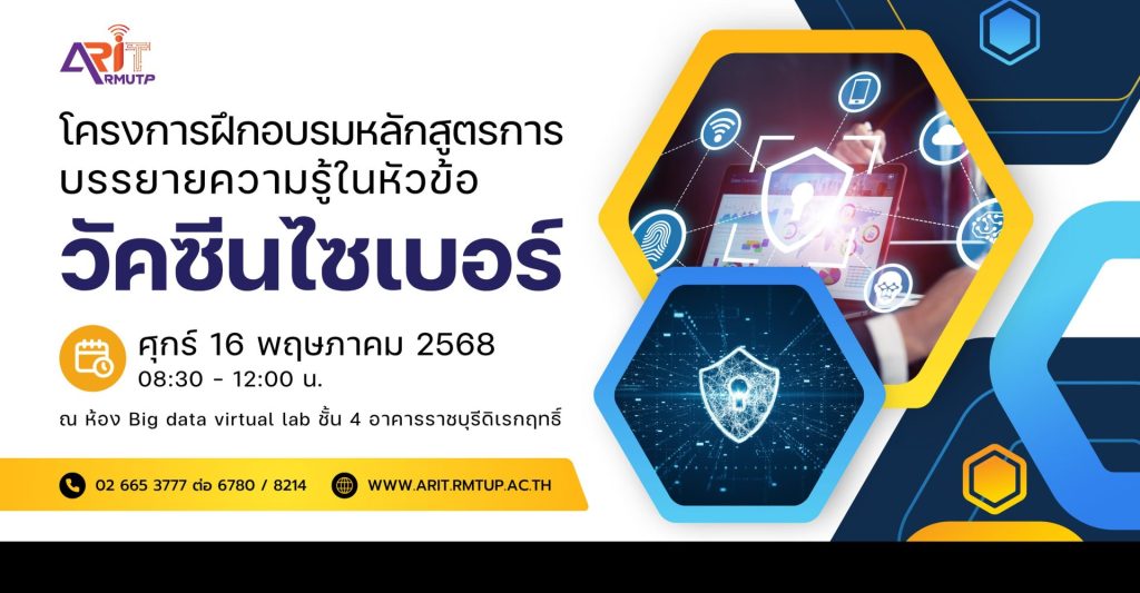 วันที่ 16 พฤษภาคม 2568 ณ ห้อง Big data virtual lab ชั้น 4 อาคารราชบุรีดิเรกฤทธิ์ สวส. จัดโครงการฝึกอบรมหลักสูตรการบรรยายความรู้ในหัวข้อ “วัคซีนไซเบอร์” เพื่อให้มีความตระหนักรู้ในความมั่นคงปลอดภัยไซเบอร์ และเพื่อให้ บุคลากร นักศึกษา