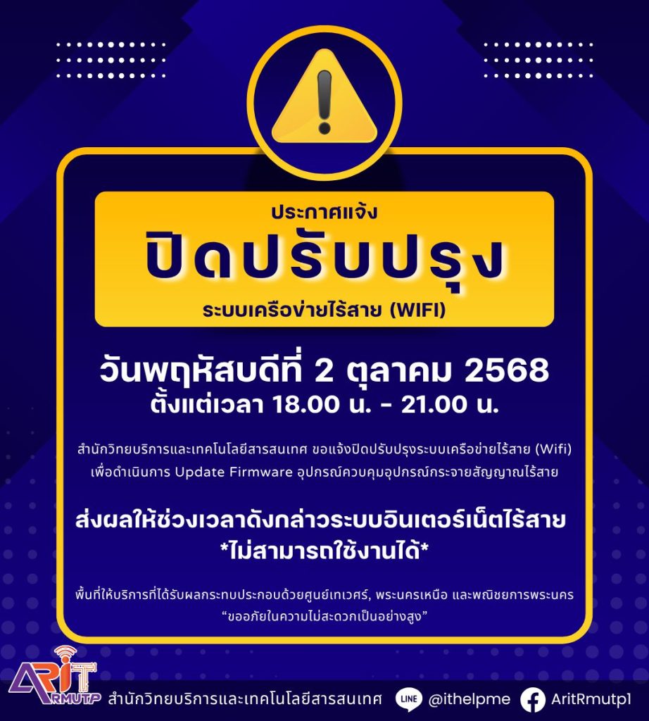 สำนักวิทยบริการแและเทคโนโลยีสารสนเทศ ขอแจ้งปิดปรับปรุงระบบเครือข่ายไร้สาย (Wifi) ในวันพฤหัสบดี ที่ 3 กันยายน 2568 ตั้งแต่เวลา 18.00 – 21.00 น. เพื่อดำเนินการ Update Firmware อุปกรณ์ควบคุมอุปกรณ์กระจายสัญญาณไร้สาย โดยจะส่งผลให้ช่วงเวลาดังกล่าวระบบอินเตอร์เน็ตไร้สายของมหาวิทยาลัยฯ ที่ให้บริการประจำศูนย์เทเวศร์, พระนครเหนือ
